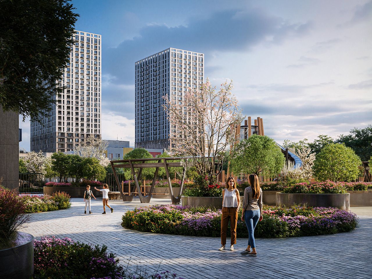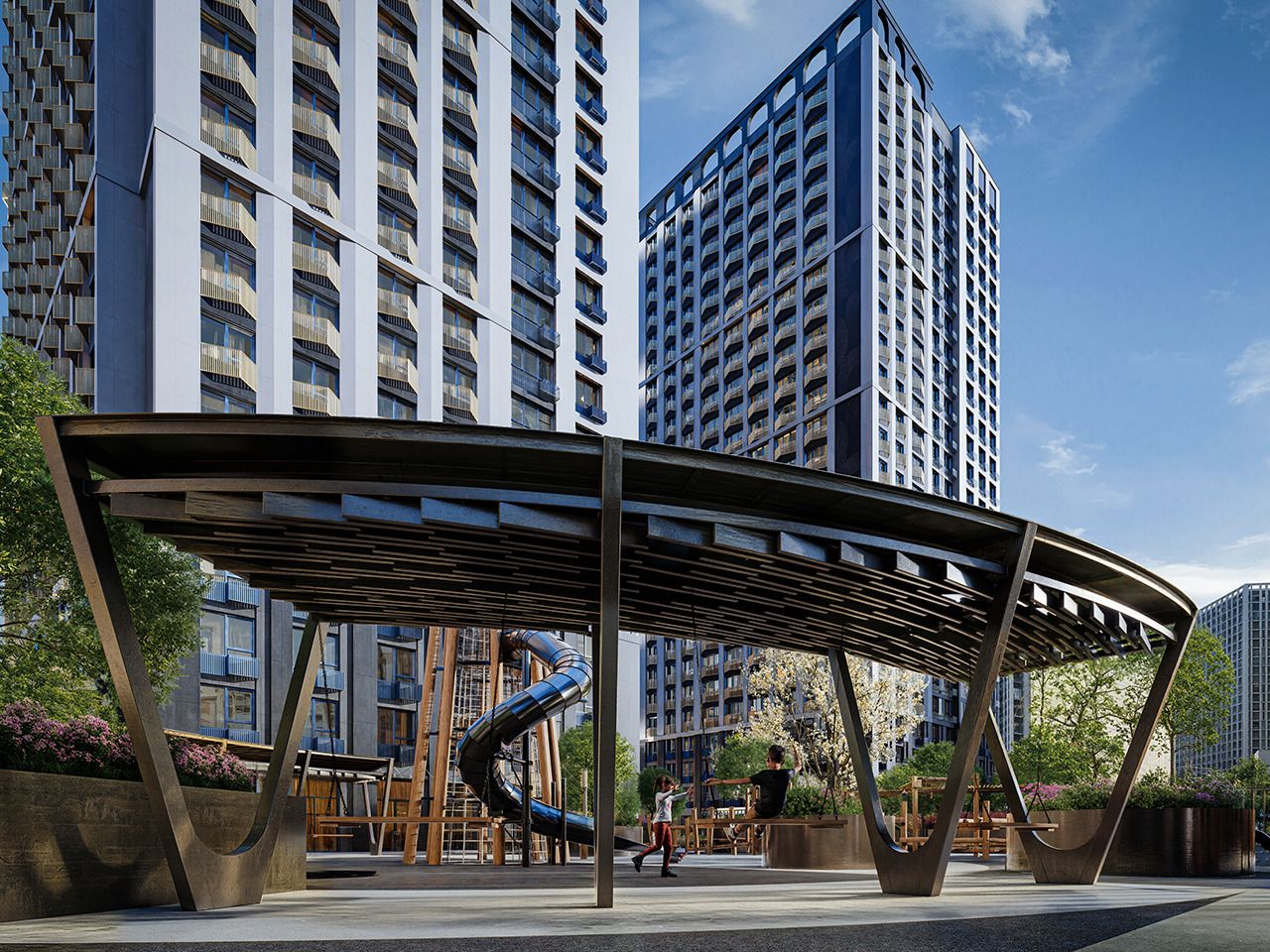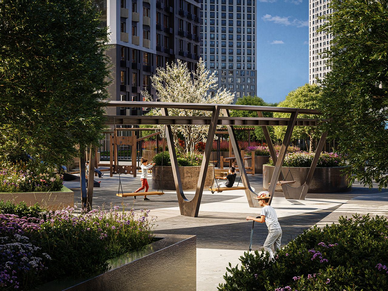 🖤ИГРОВЫЕ ПРОСТРАНСТВА. Балансиры, песочницы, игровые комплексы, элементы из геопластика, словно лунные кратеры, батуты, качели — настоящий «лунный» мини-парк.
